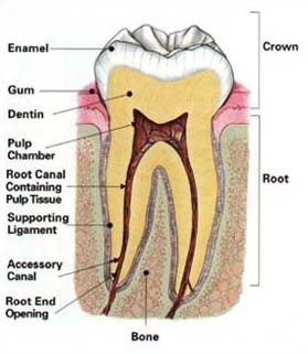 In order to understand Endodontic treatment, it helps to know something about the anatomy of a tooth. Teeth have several layers. The outside layer of the tooth is composed of a hard layer called Enamel. Enamel is supported by an inner layer called Dentin, which has at its center a soft tissue known as the Pulp.